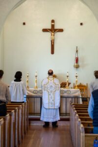 The week’s activities started off with a special guest: Father Bryce Lungren, a priest from the Diocese of Cheyenne (currently serving in Buffalo) and the author of The Catholic Cowboy Way: Finding Peace and Purpose on the Bronc Called Life and The Catholic Cowboy Way of Prayer. After celebrating Mass at noon in the College’s Immaculate Conception Oratory, the group headed out to the arena, where Father had the opportunity to offer his reflections on the many ways in which horsemanship (and the kinds of training they’re undertaking this week) serves as the perfect metaphor for the spiritual life. “Life with Christ is such an adventure,” he reminded them. “You’re already ahead of the game. Stay on track; stay humble. Stay disciplined. Keep up the good work. And God bless you!”
