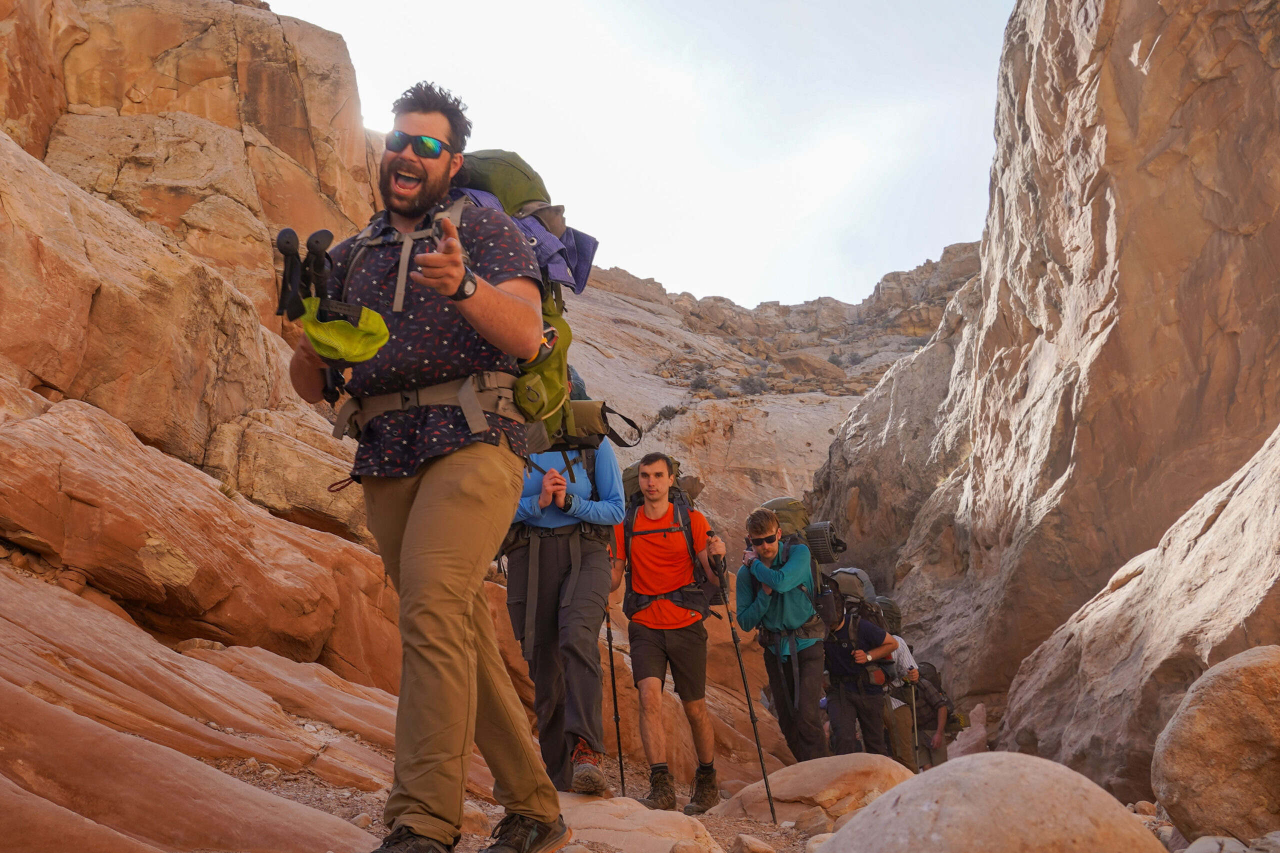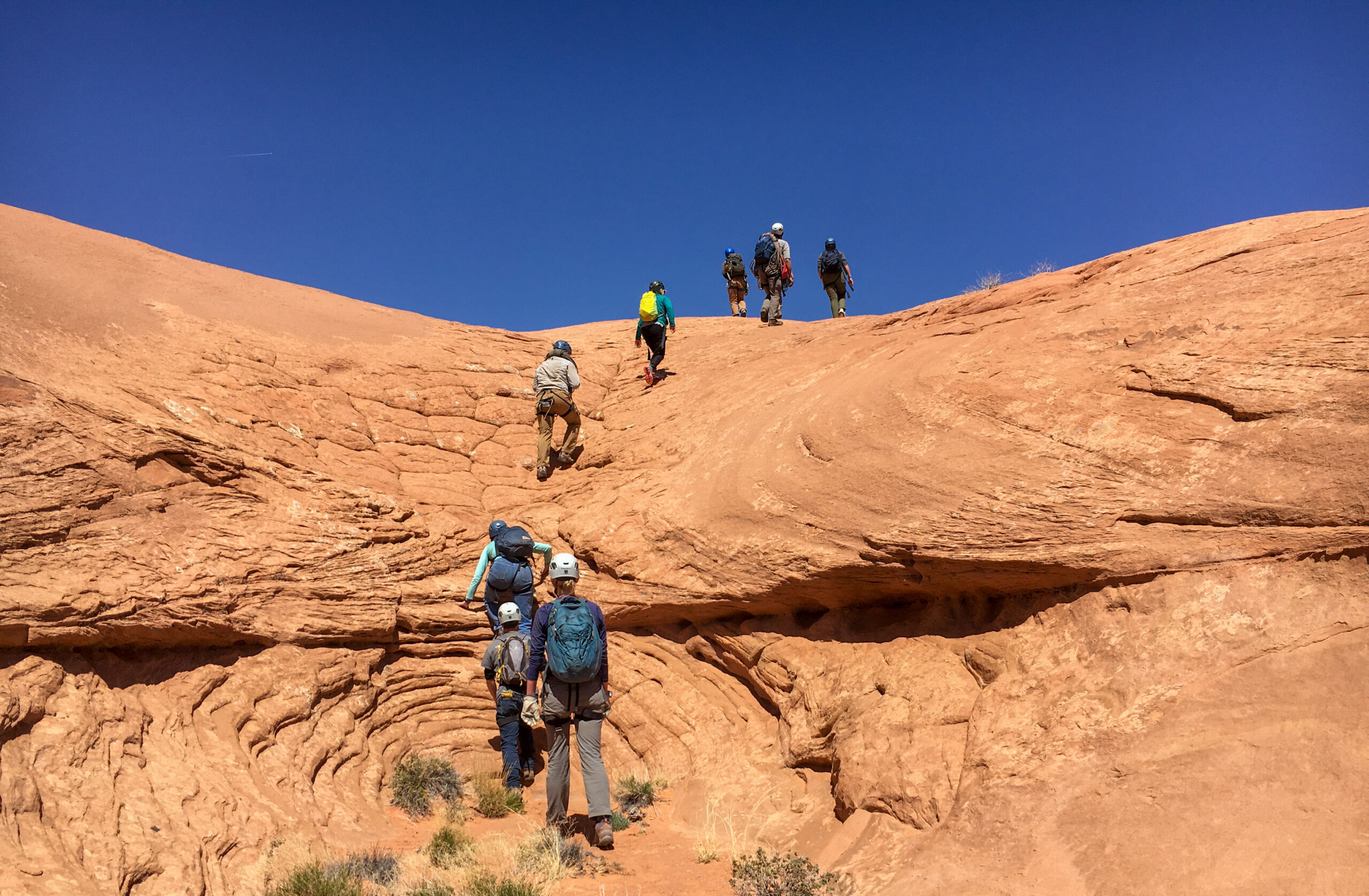 OK, so “losing your grip on reality” is a trifle hyperbolic, perhaps, but make no mistake: this journey through the canyon lands of southeastern Utah is a truly formidable one, both physically and mentally. The canyon names alone would alert visitors to that fact; Dark Canyon and Lost Canyon feature prominently in the group’s pre-trip planning, as does the chillingly-title “Sandthrax.” The difficulty and dryness of the terrain are formidable obstacles, and the heat is a constant presence that must be managed throughout the day. And route-finding and navigation are often challenging, though both are areas that typically see dramatic improvement throughout the week.